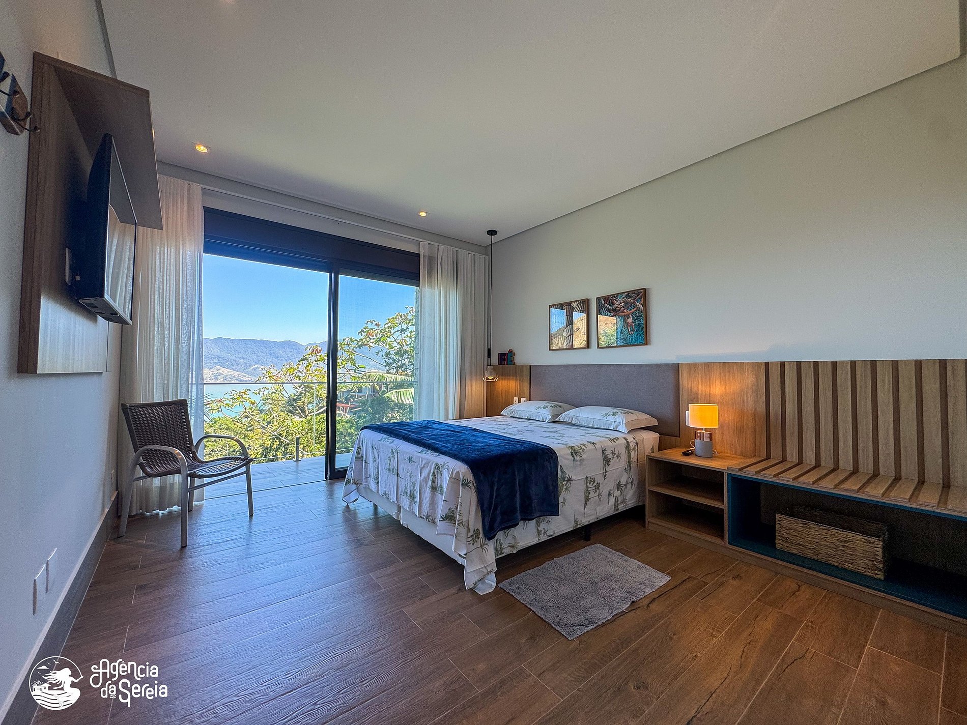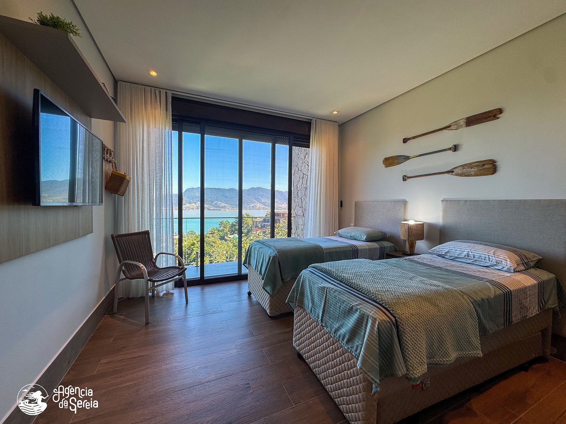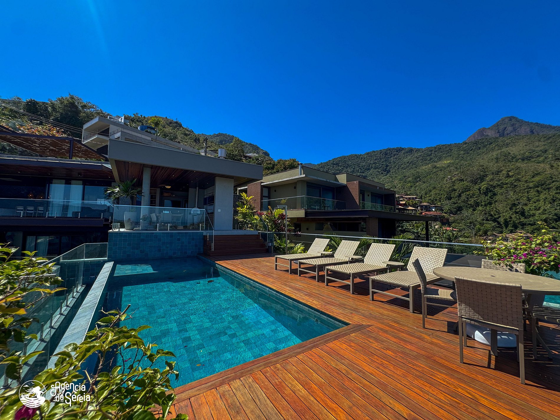 Casa luxuosa em condomínio fechado no coração de Ilhabela. São 5 suítes climatizadas, piscina aquecida, sauna, varanda gourmet com forno de pizza e churrasqueira. Vista deslumbrante para o mar e montanha, perfeita para apreciar o pôr do sol mais lindo da ilha. Conforto, sofisticação e momentos inesquecíveis para até 10 pessoas.