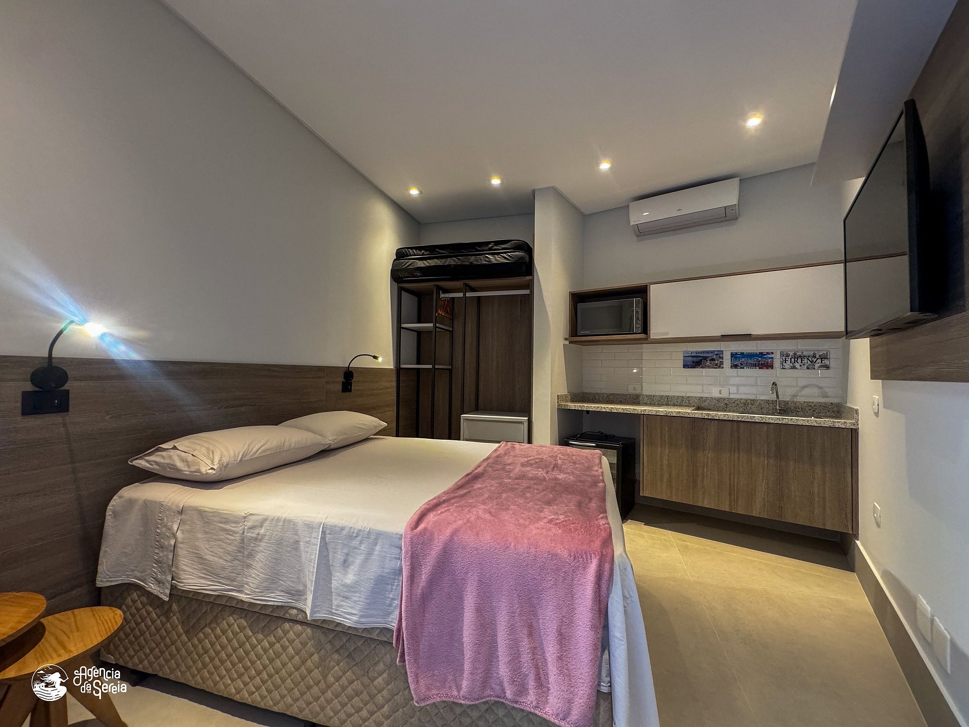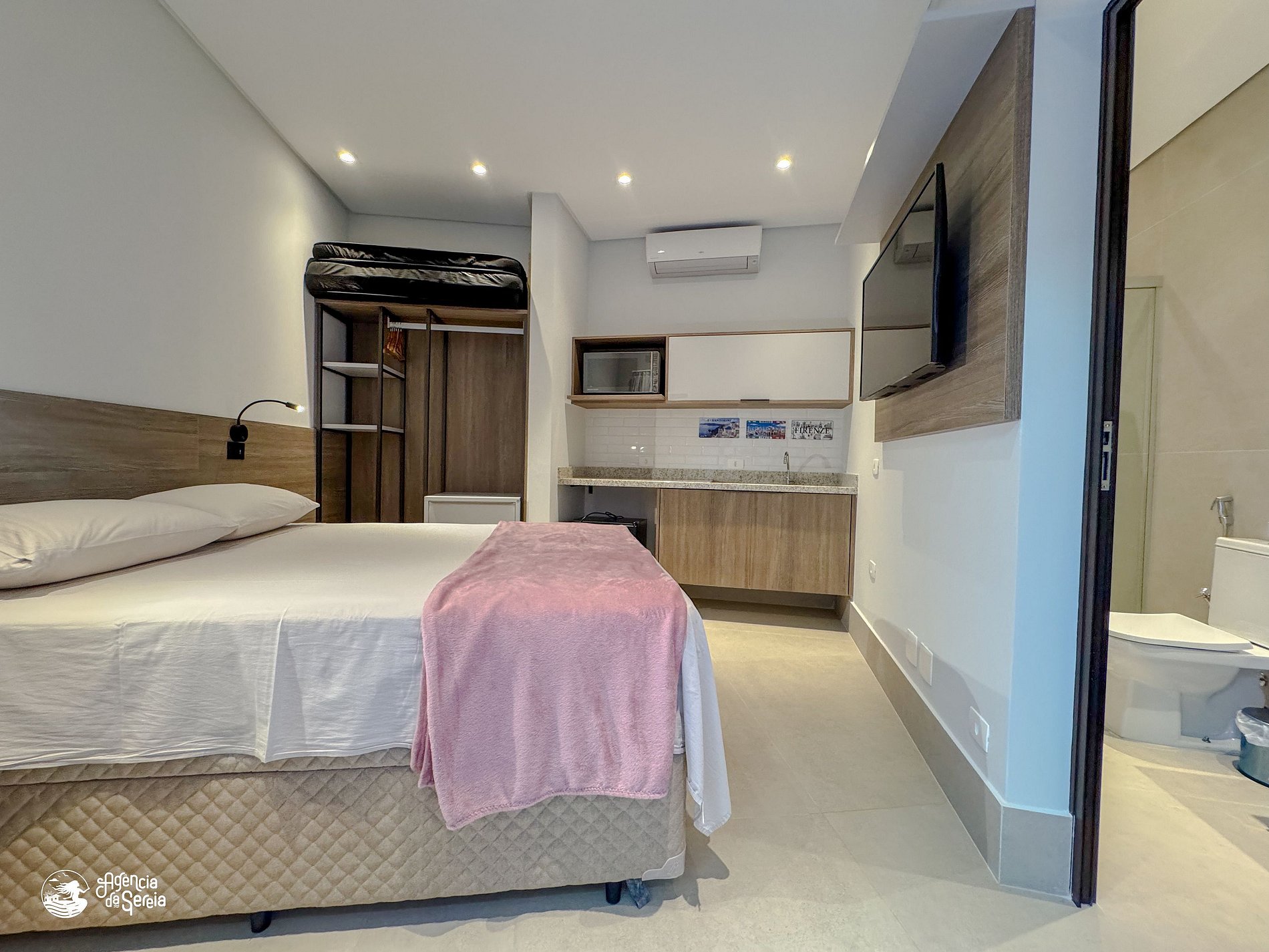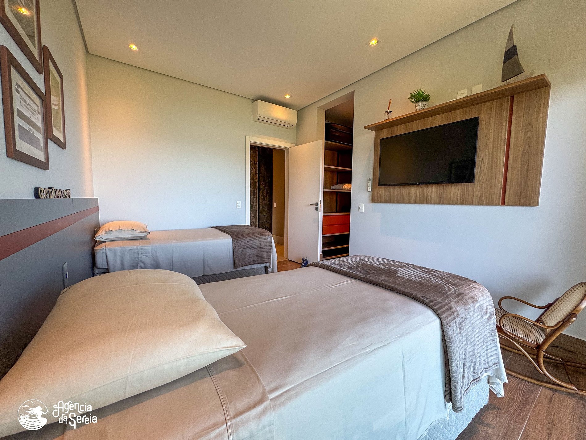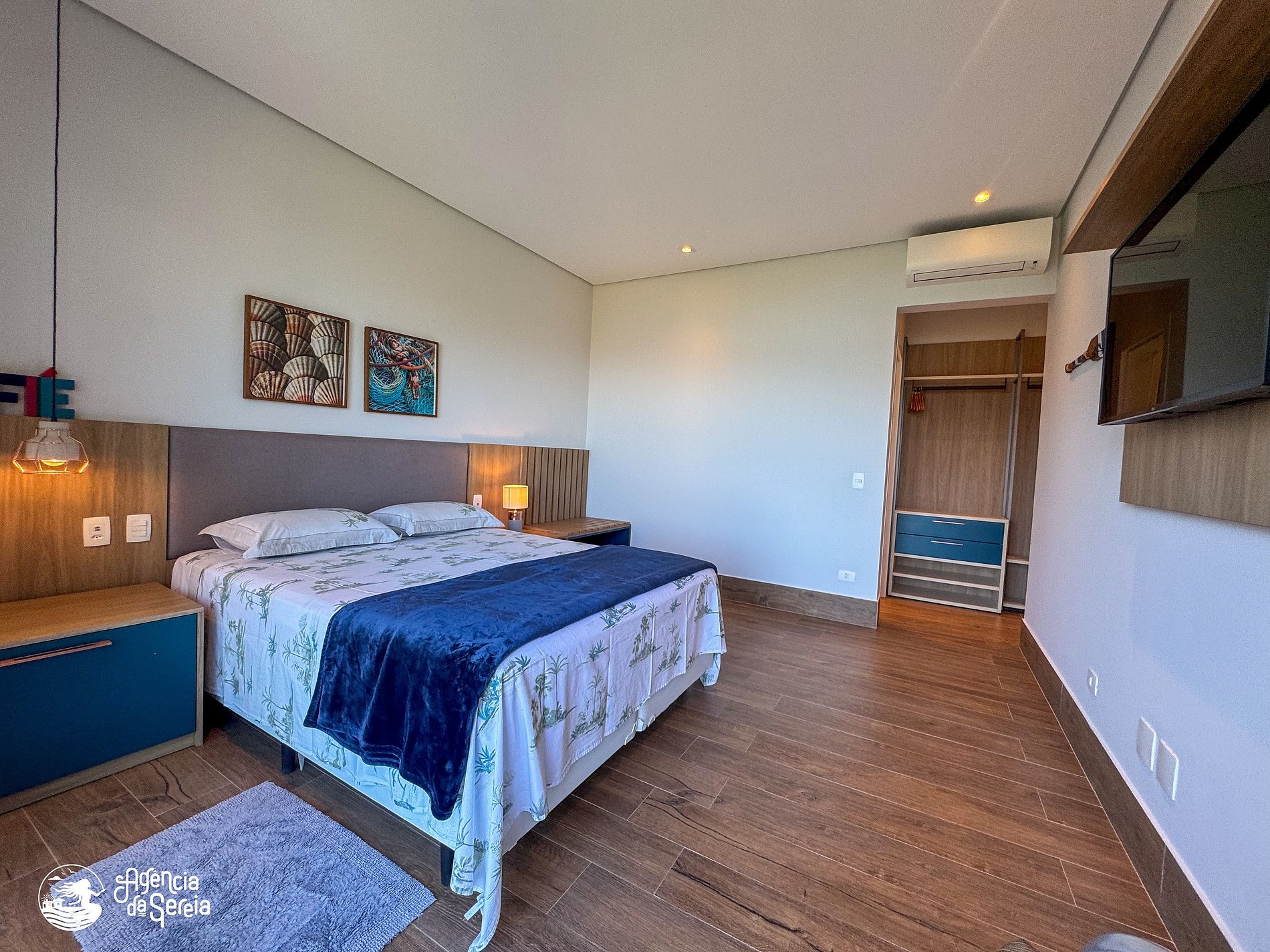 Além das 5 suítes disponíveis, a propriedade conta com uma suíte master de cinema, equipada com banheira, varanda e vista panorâmica. Essa suíte é reservada, mas pode ser liberada como cortesia para estadias acima de 7 dias ou mediante valor adicional. Uma experiência que transforma sua viagem em algo ainda mais inesquecível.