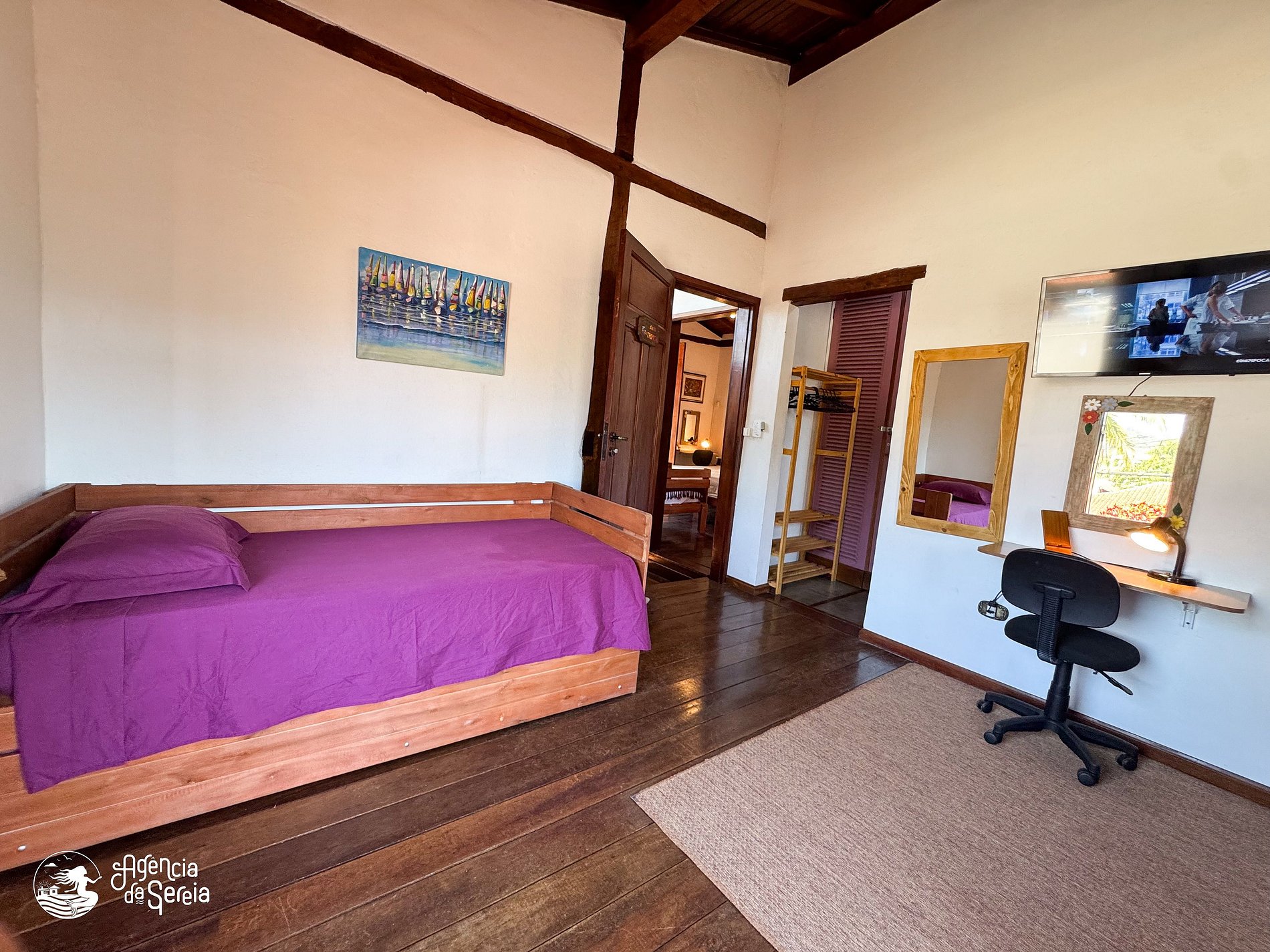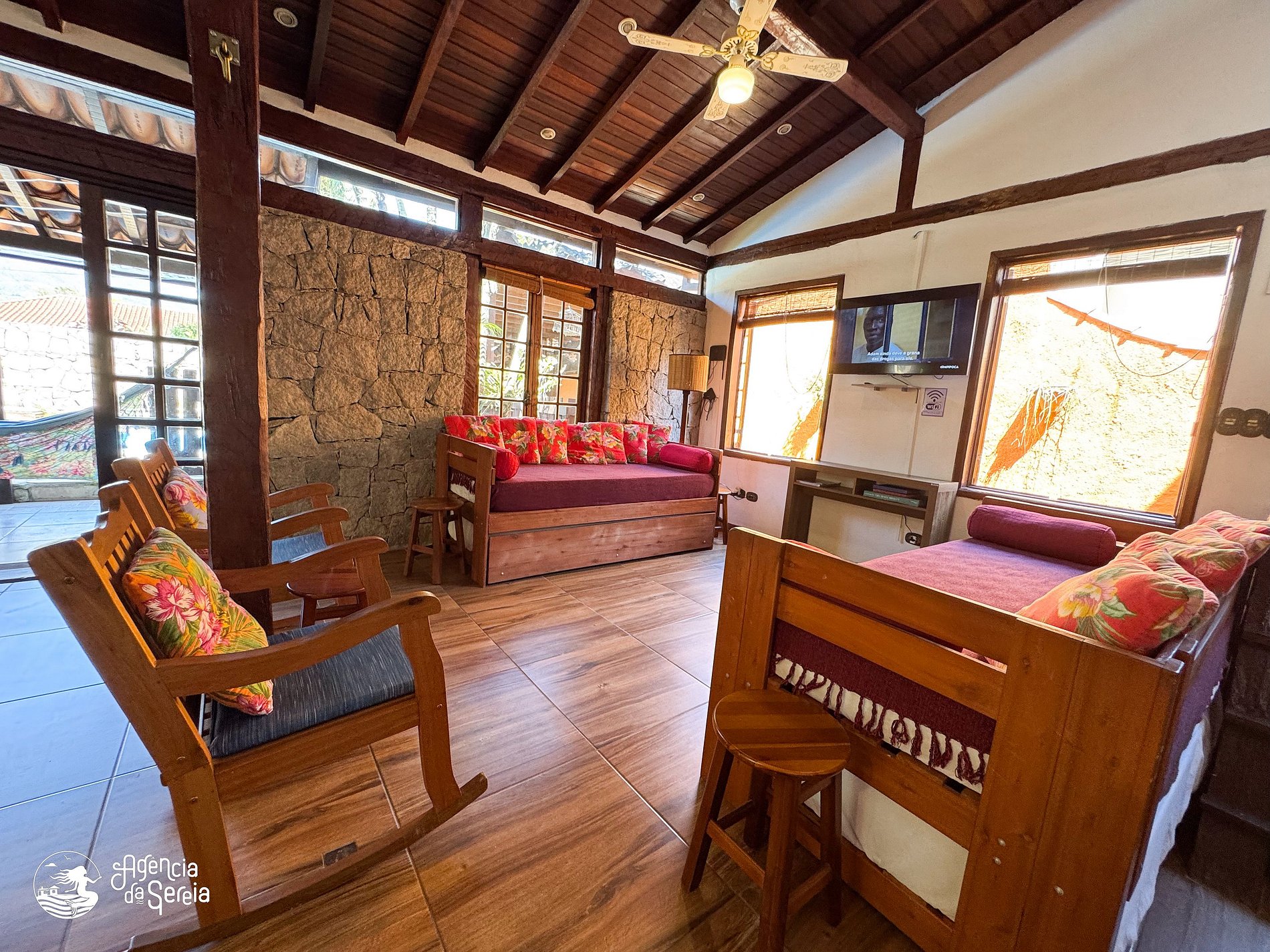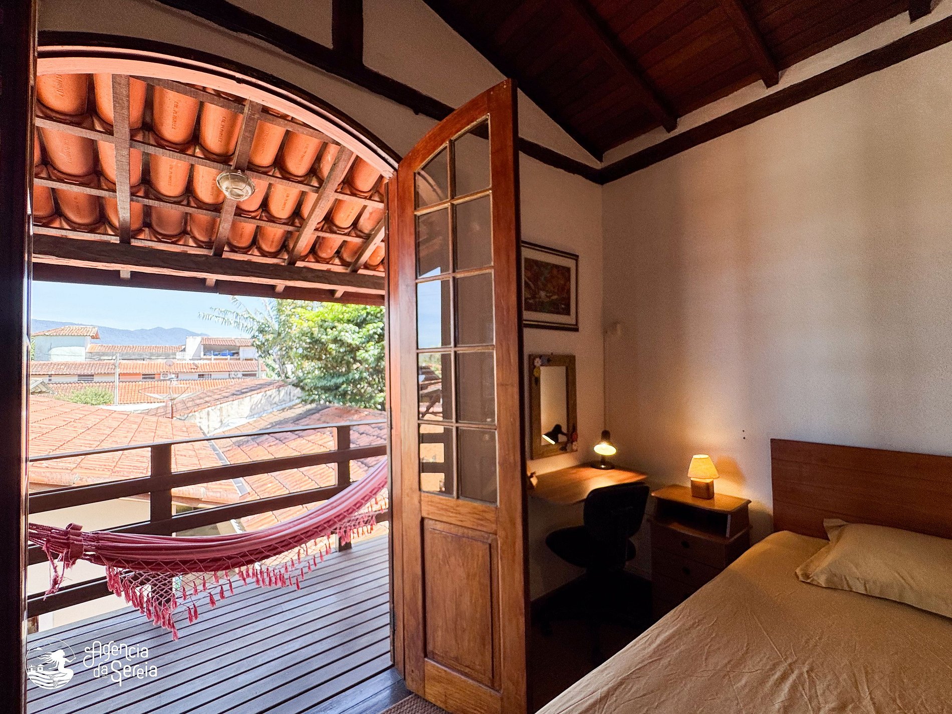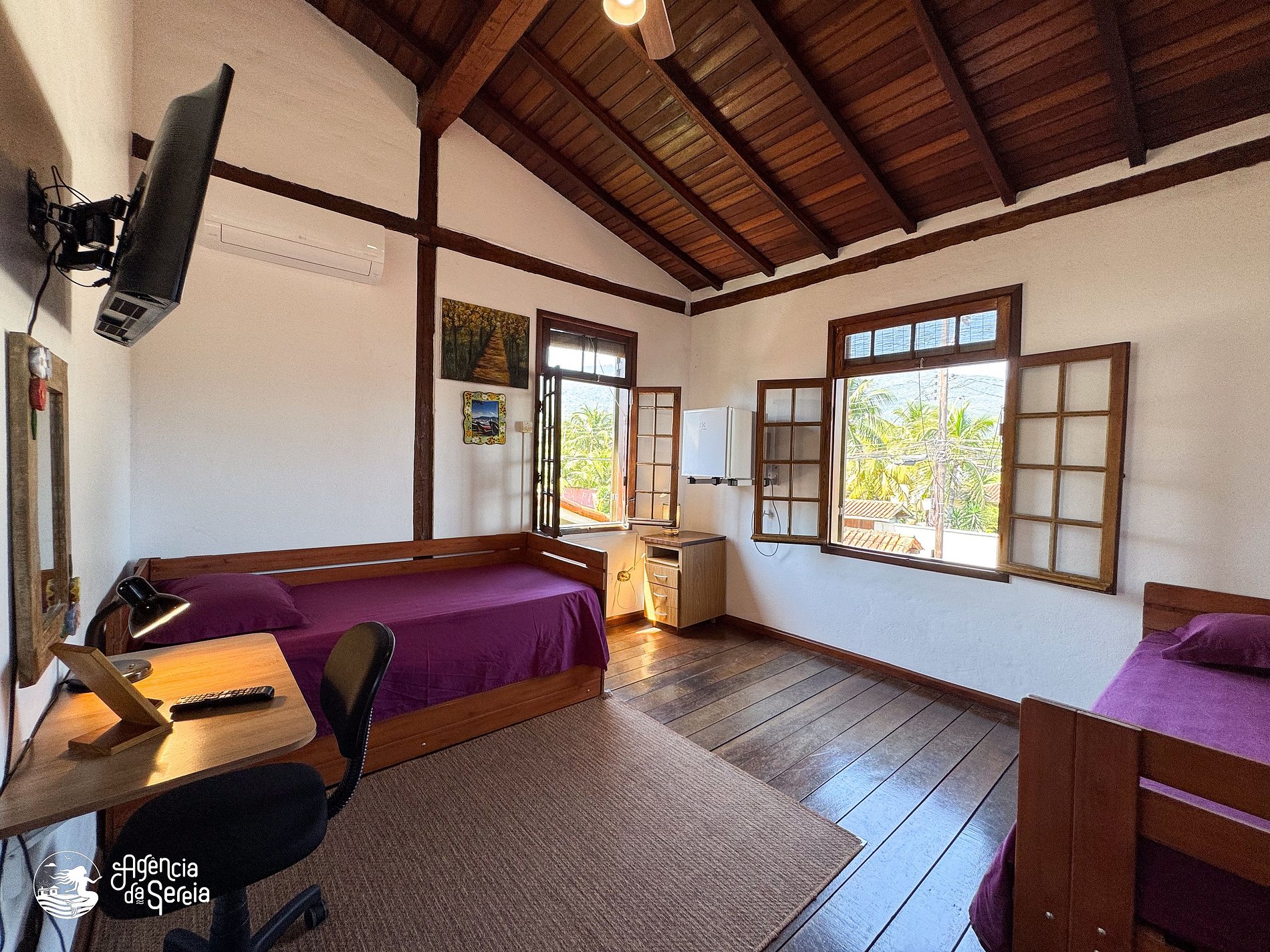 • Suíte Master (andar superior): cama de casal + cama de solteiro, varanda privativa, frigobar, espaço para home office, arara de roupas e ar-condicionado;