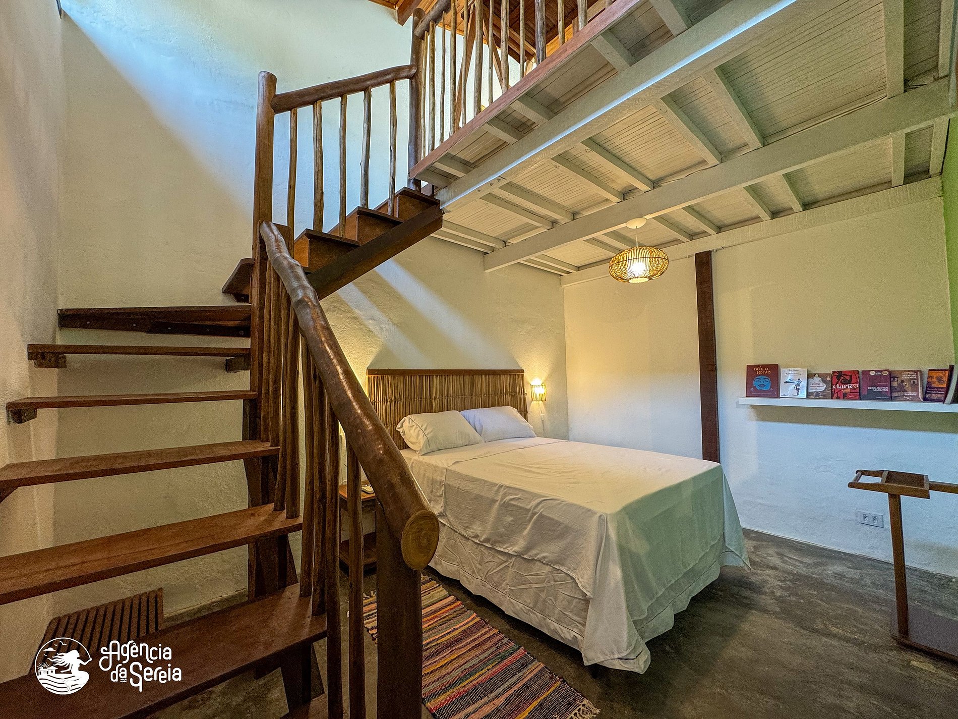 As suítes são privativas, enquanto as áreas externas — incluindo piscina, jardim e acessos — são compartilhadas com outros hóspedes e visitantes da livraria. O acesso aos chalés é feito passando pela livraria e por uma casa no terreno, reforçando o clima de acolhimento e convivência tranquila.