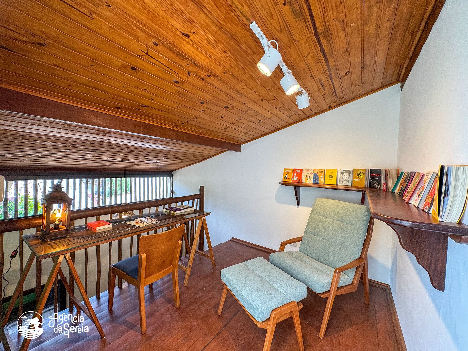 No andar superior, o chalé oferece um espaço especial dedicado à leitura e à escrita, com mesa, cadeira e estantes com livros. Há também um terraço agradável, ideal para apreciar a paisagem e aproveitar momentos de contemplação. A combinação dos ambientes torna este chalé perfeito para estadias mais longas, viagens criativas ou momentos de descanso em família ou entre amigos.