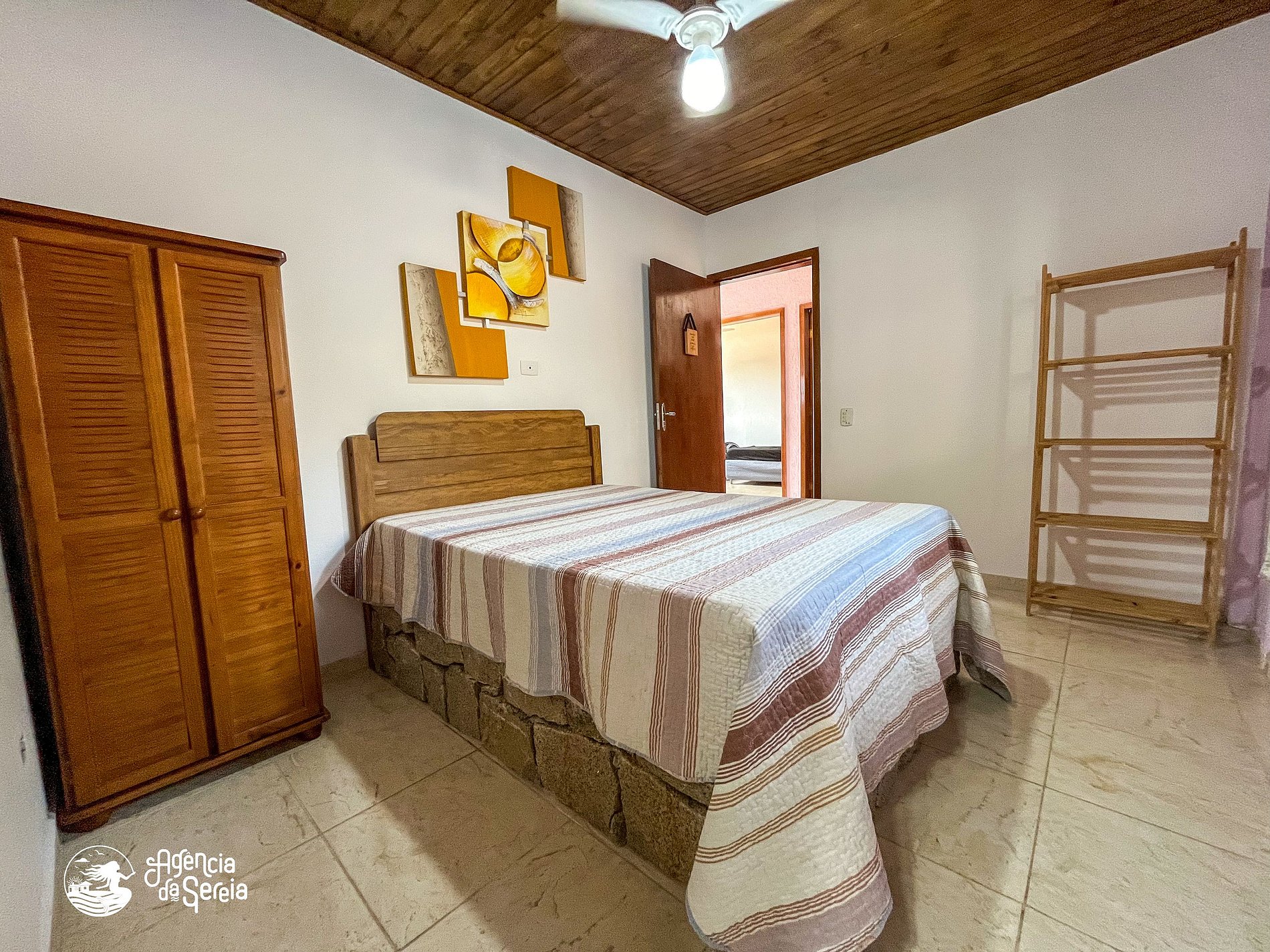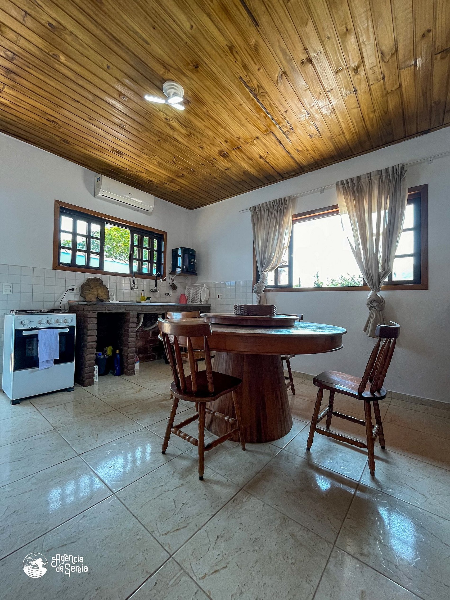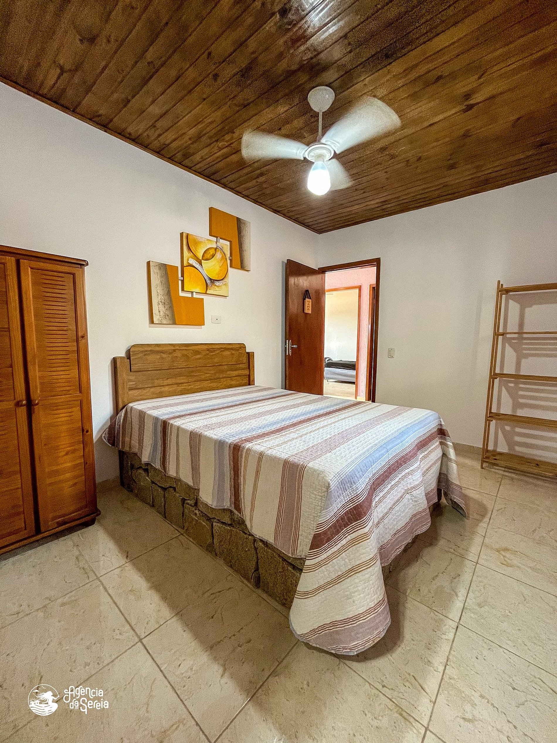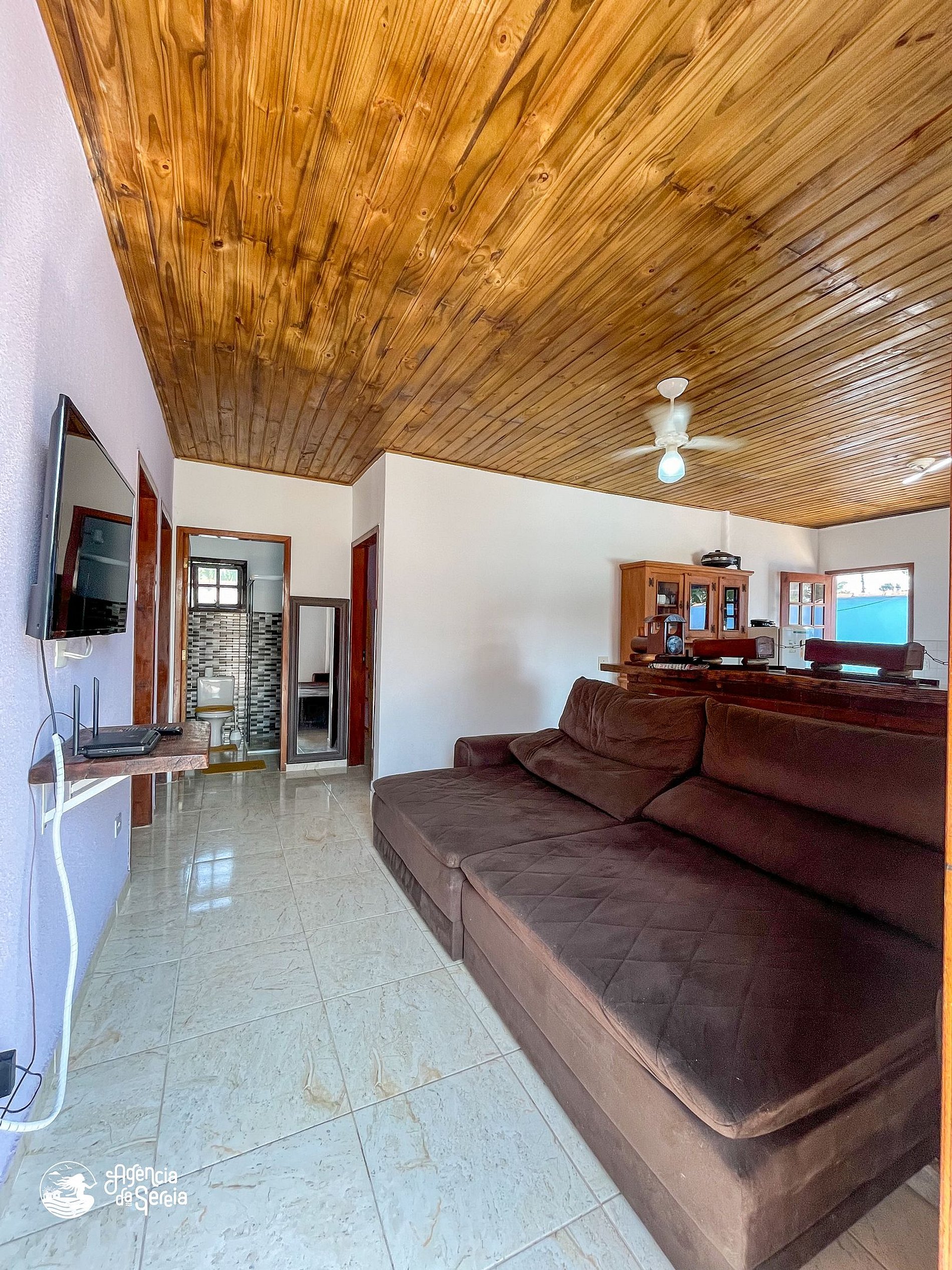Capacidade para acomodar até 7 pessoas em cama, divididas em 3 quartos, sendo 1 suíte com cama de casal (base de pedra) e ventilador de teto e 2 quartos com camas de solteiro (box) e beliche colonial solteiro, além de ventilador de teto. Sala com sofá retrátil, TV e ventilador de teto, ideal para relaxar após um dia de praia. Cozinha completa com todos os utensílios necessários para preparar suas refeições, incluindo filtro, fogão, forno, geladeira, microondas e mesa com balcão em peroba rosa. A área externa conta com uma piscina enorme, para curtir dias de sol preparando um churrasquinho para a galera. A área externa ainda conta com banquinhos de madeira, geladeira e pia para sua comodidade.