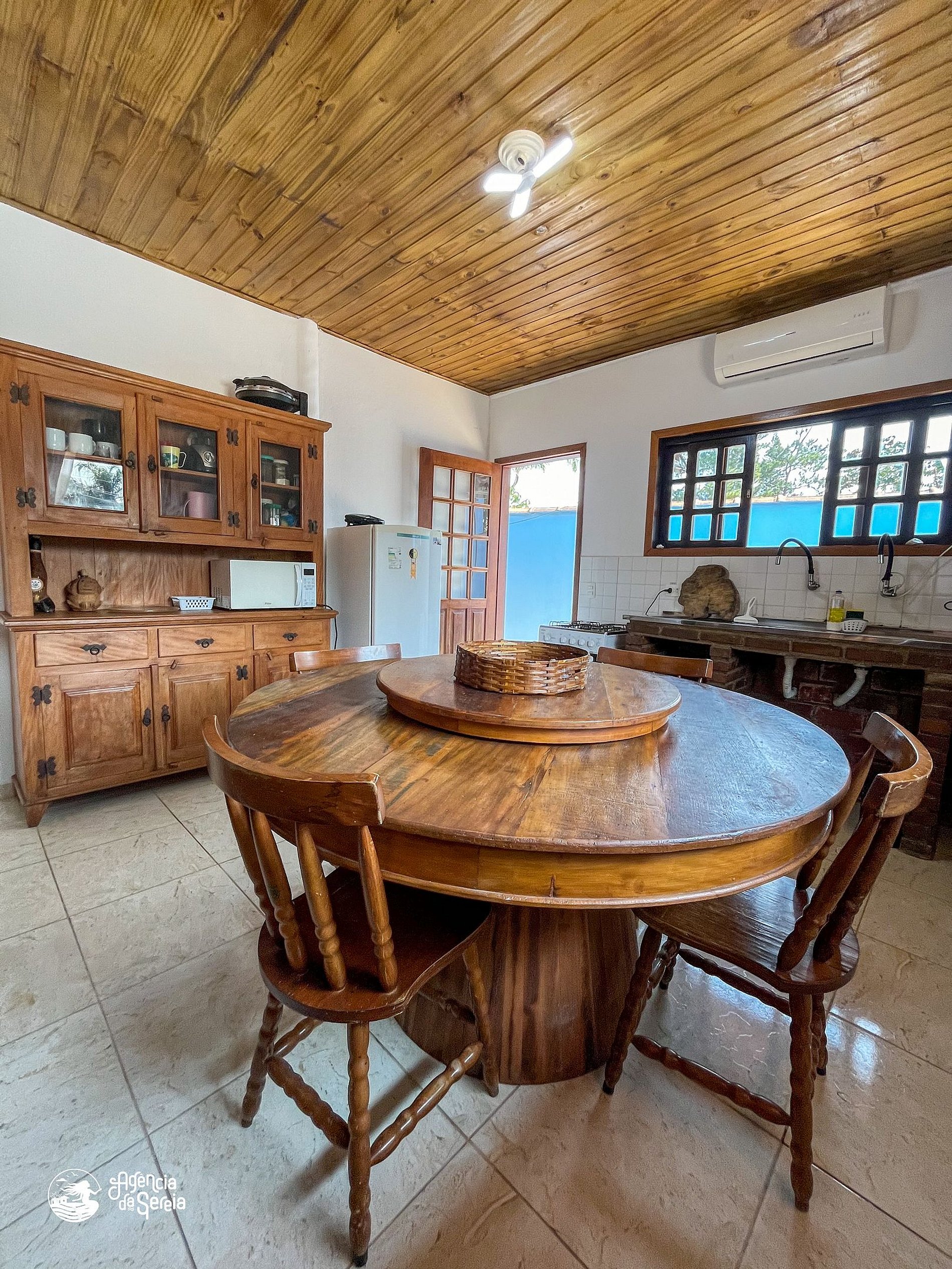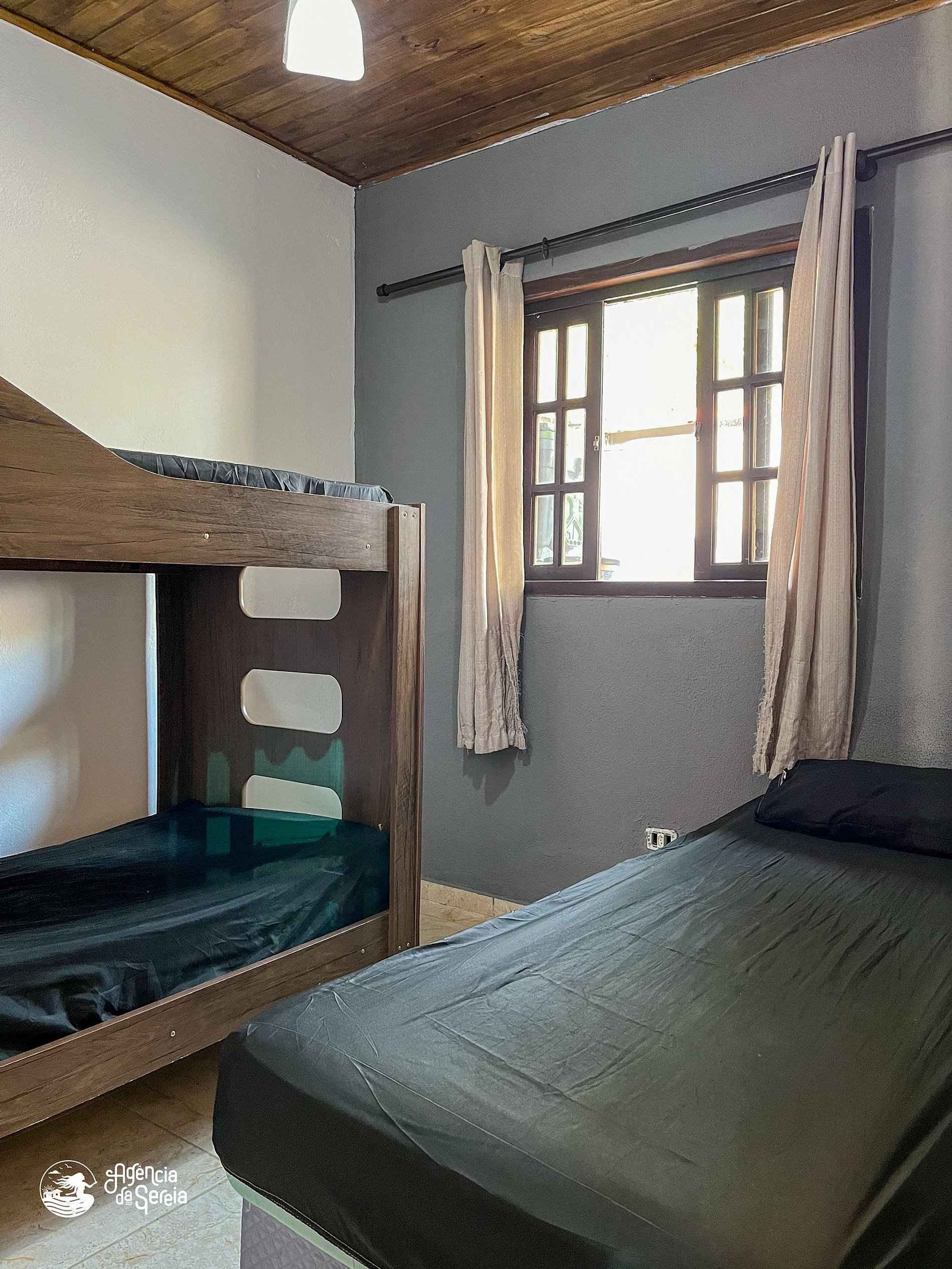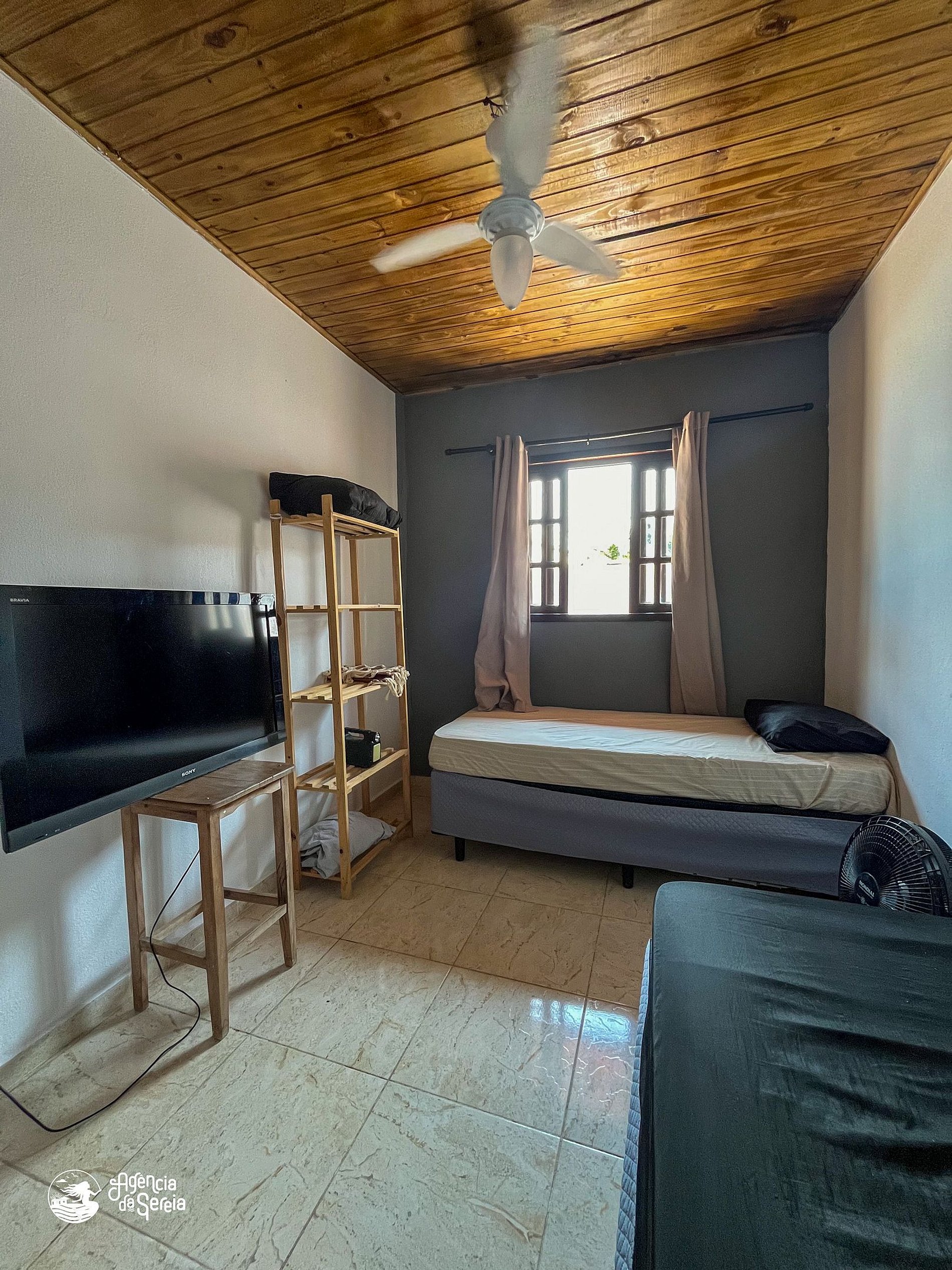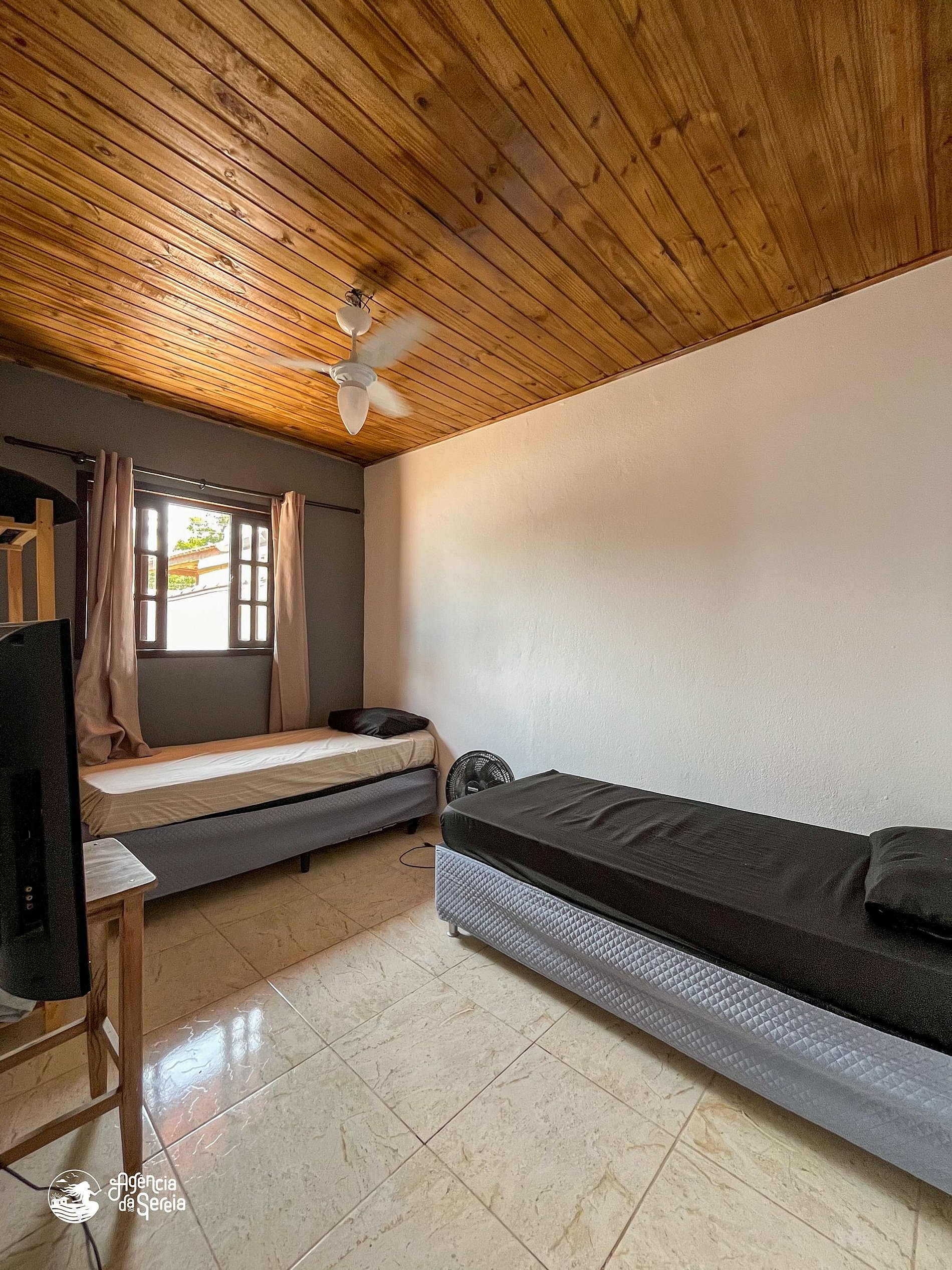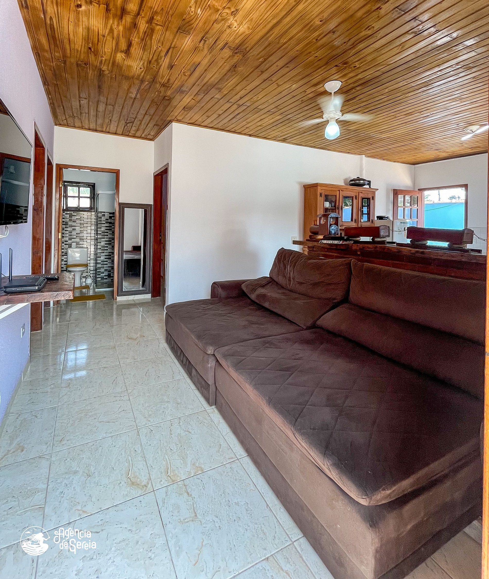 Capacidade para acomodar até 7 pessoas em cama, divididas em 3 quartos, sendo 1 suíte com cama de casal (base de pedra) e ventilador de teto e 2 quartos com camas de solteiro (box) e beliche colonial solteiro, além de ventilador de teto. Sala com sofá retrátil, TV e ventilador de teto, ideal para relaxar após um dia de praia. Cozinha completa com todos os utensílios necessários para preparar suas refeições, incluindo filtro, fogão, forno, geladeira, microondas e mesa com balcão em peroba rosa. A área externa conta com uma piscina enorme, para curtir dias de sol preparando um churrasquinho para a galera. A área externa ainda conta com banquinhos de madeira, geladeira e pia para sua comodidade.