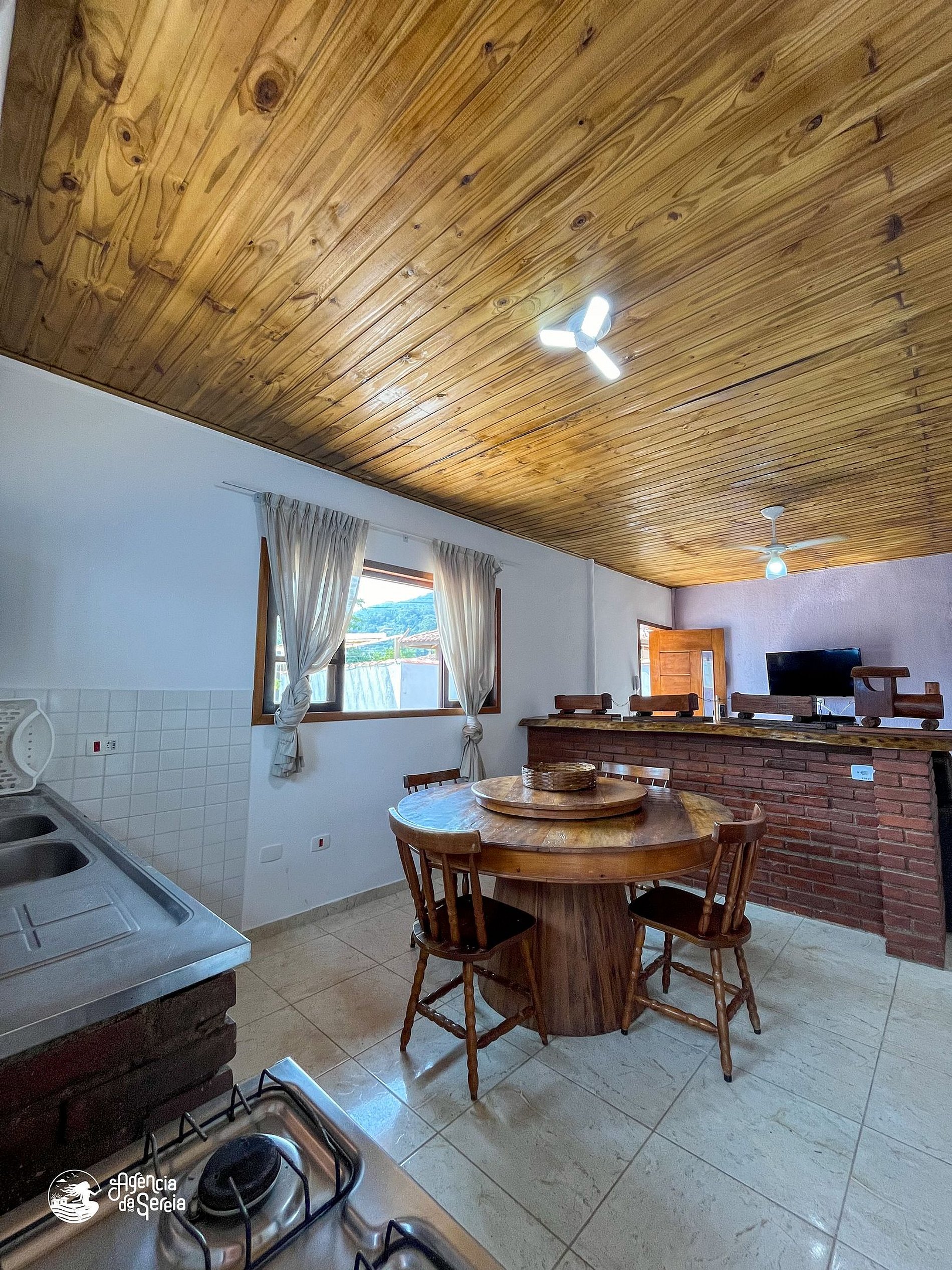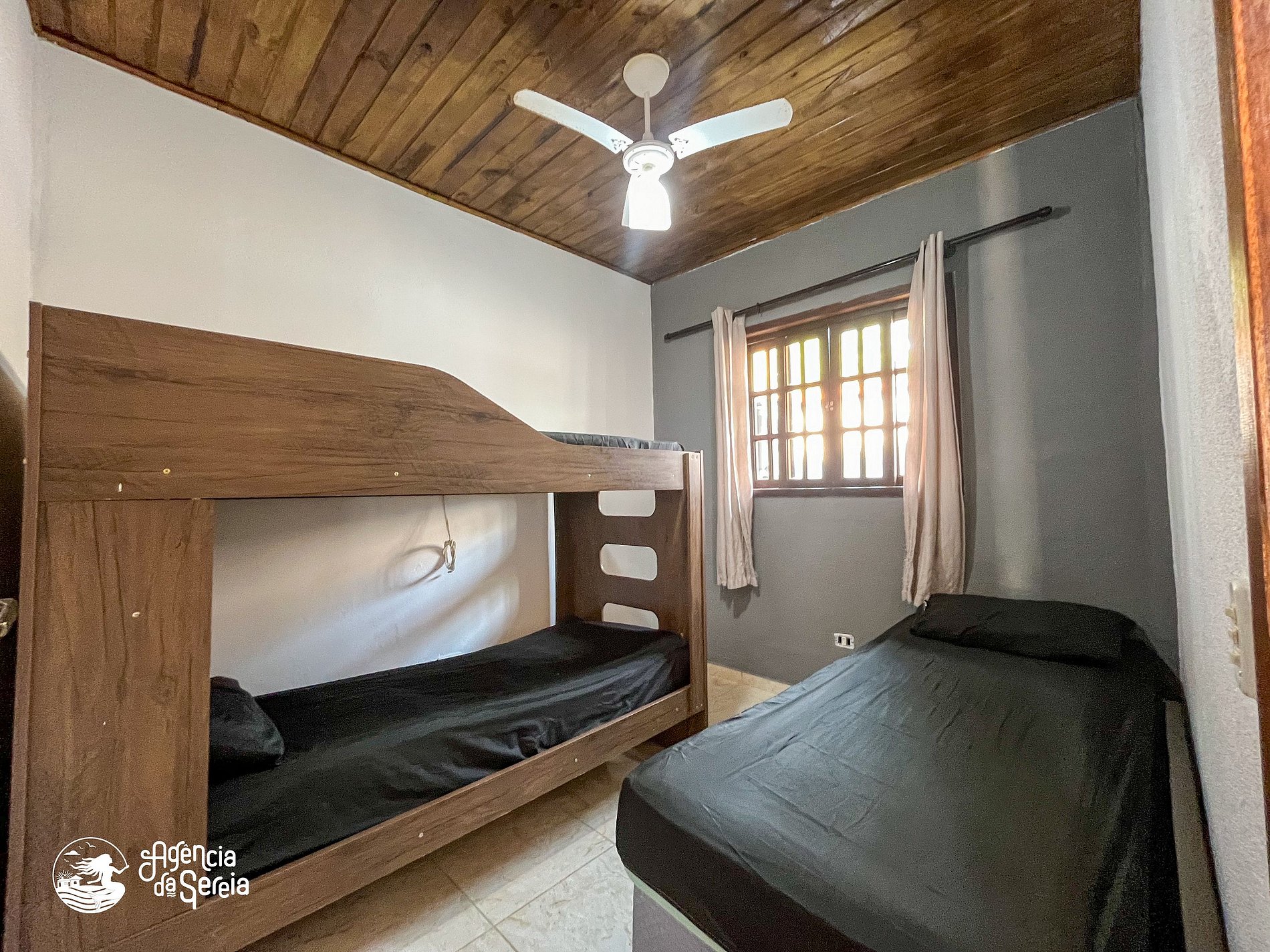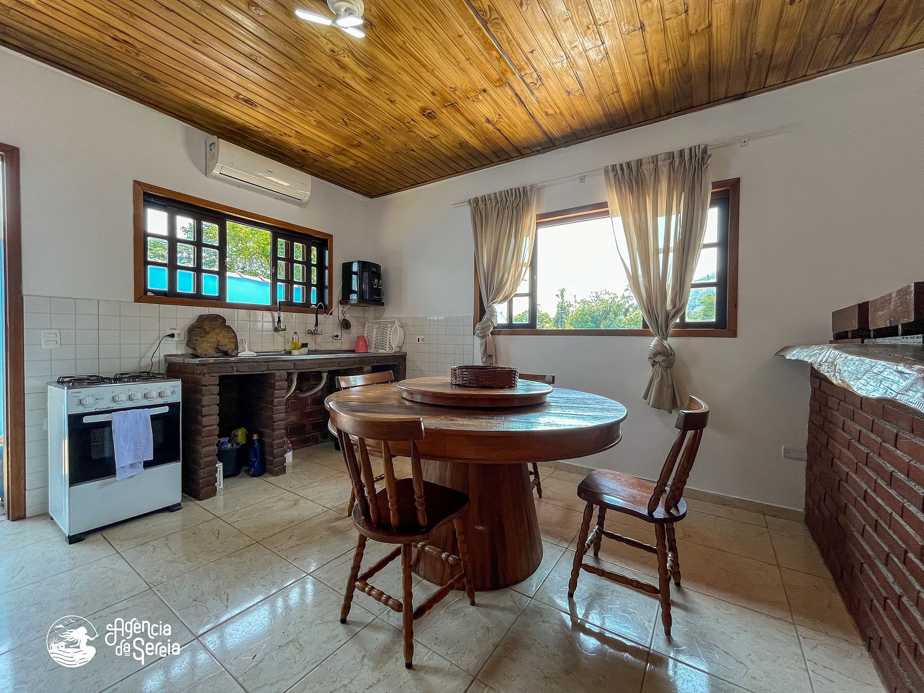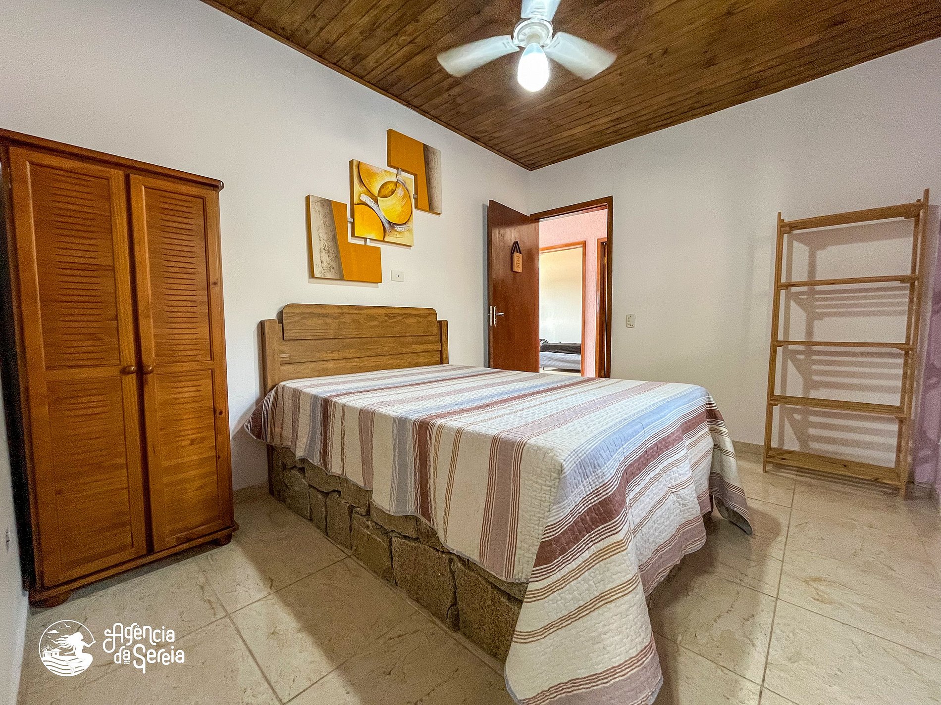 Capacidade para acomodar até 7 pessoas em cama, divididas em 3 quartos, sendo 1 suíte com cama de casal (base de pedra) e ventilador de teto e 2 quartos com camas de solteiro (box) e beliche colonial solteiro, além de ventilador de teto. Sala com sofá retrátil, TV e ventilador de teto, ideal para relaxar após um dia de praia. Cozinha completa com todos os utensílios necessários para preparar suas refeições, incluindo filtro, fogão, forno, geladeira, microondas e mesa com balcão em peroba rosa. A área externa conta com uma piscina enorme, para curtir dias de sol preparando um churrasquinho para a galera. A área externa ainda conta com banquinhos de madeira, geladeira e pia para sua comodidade.