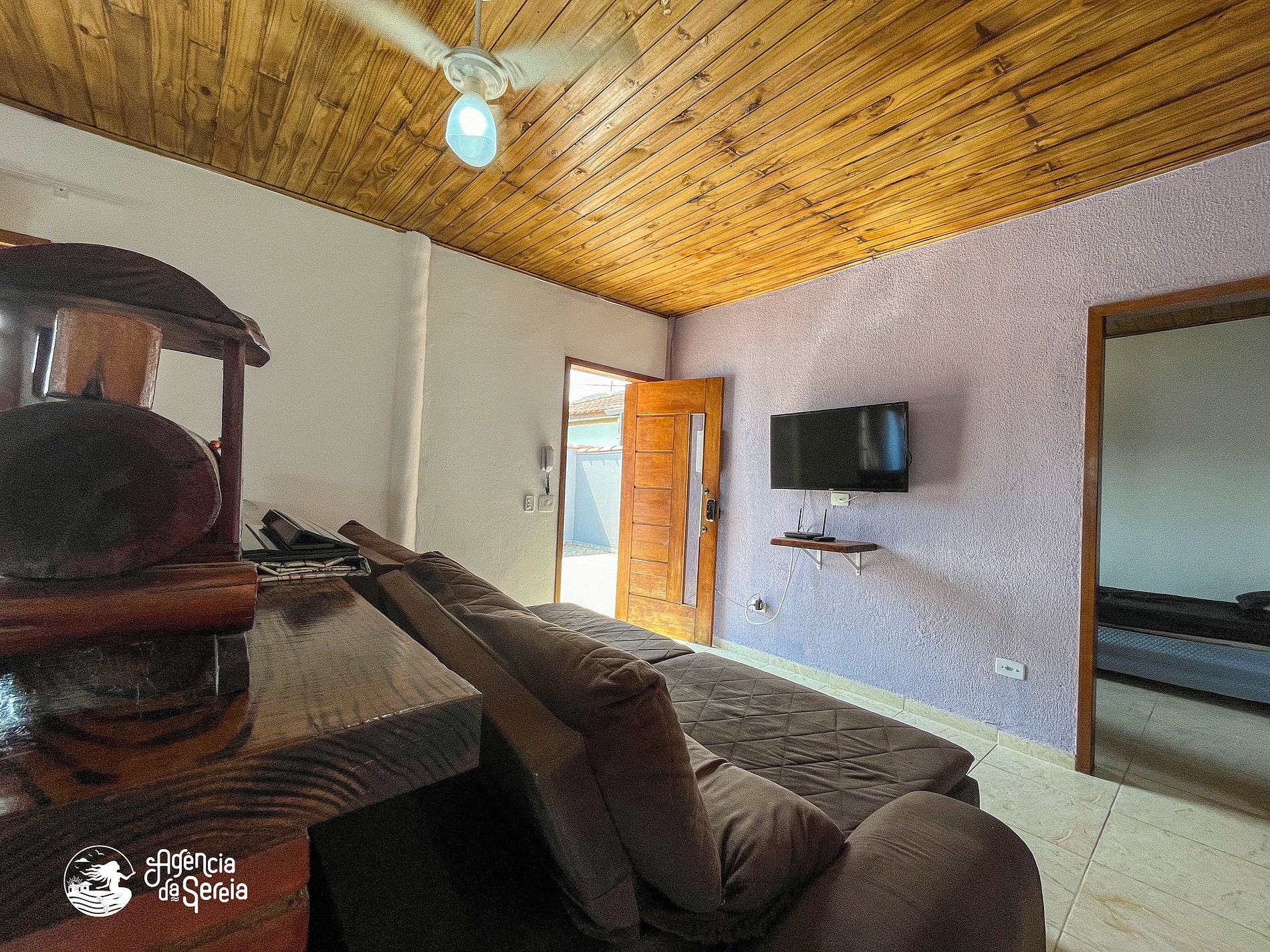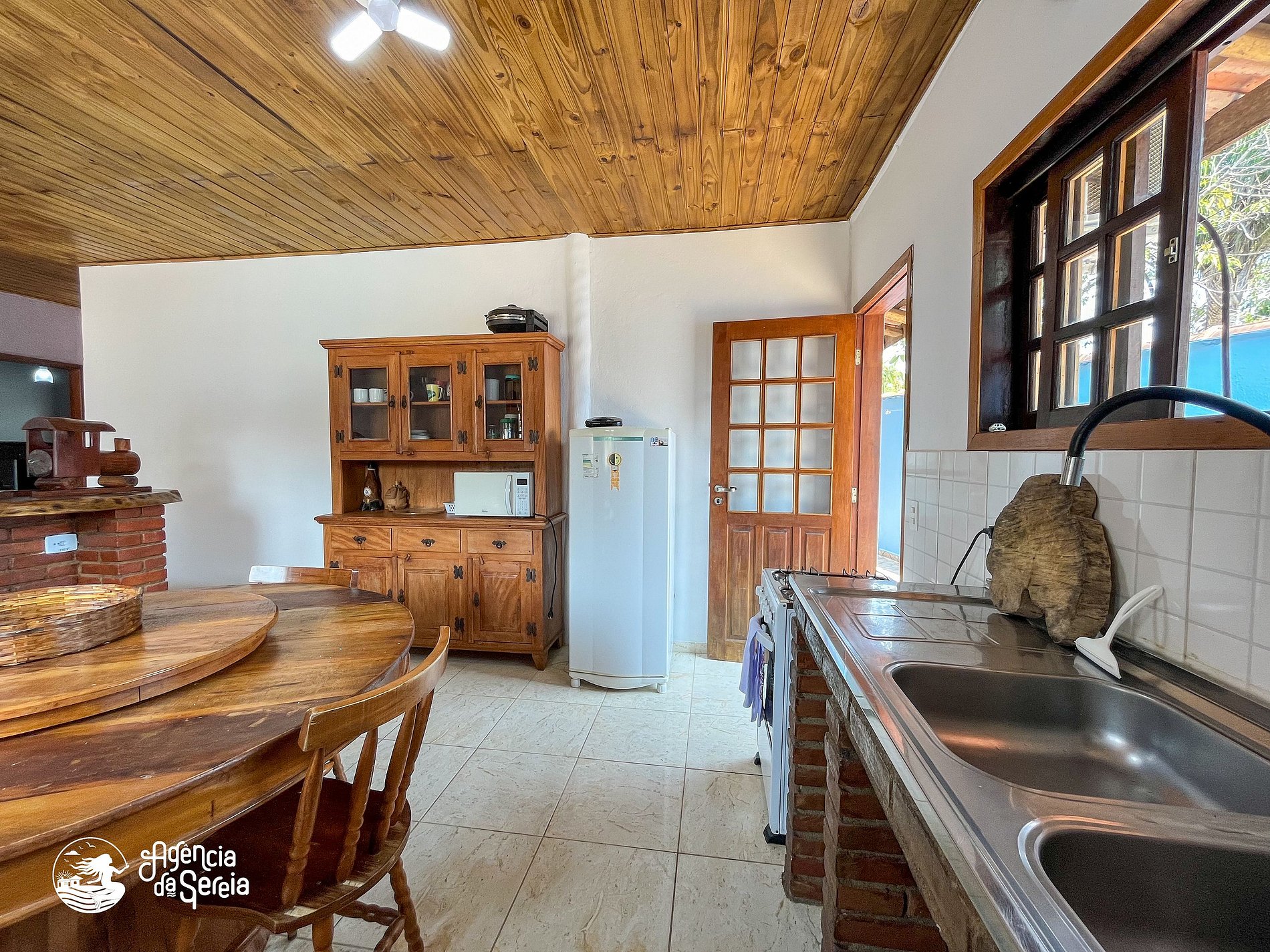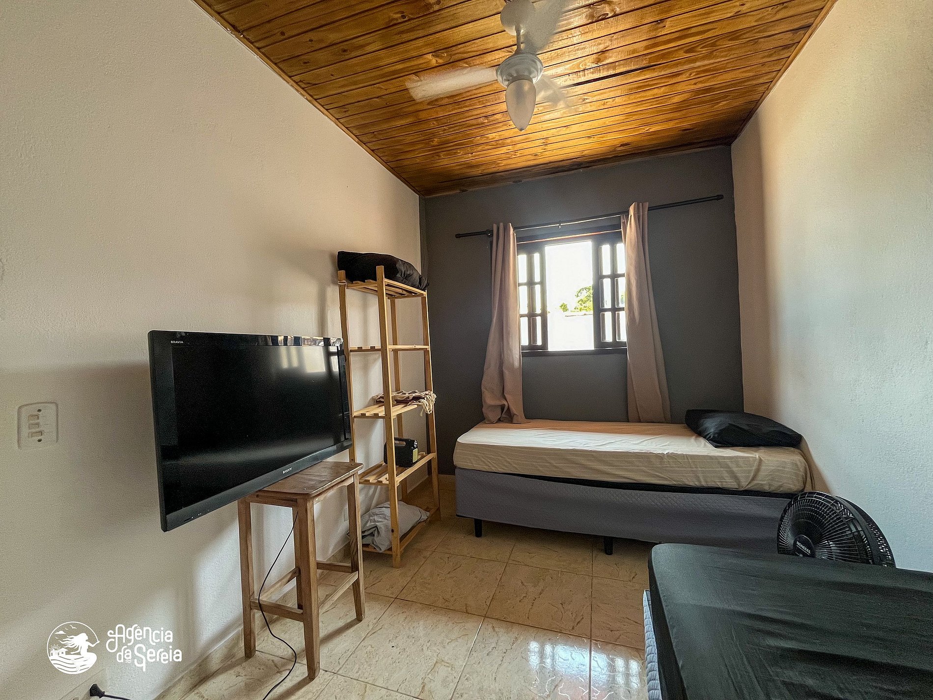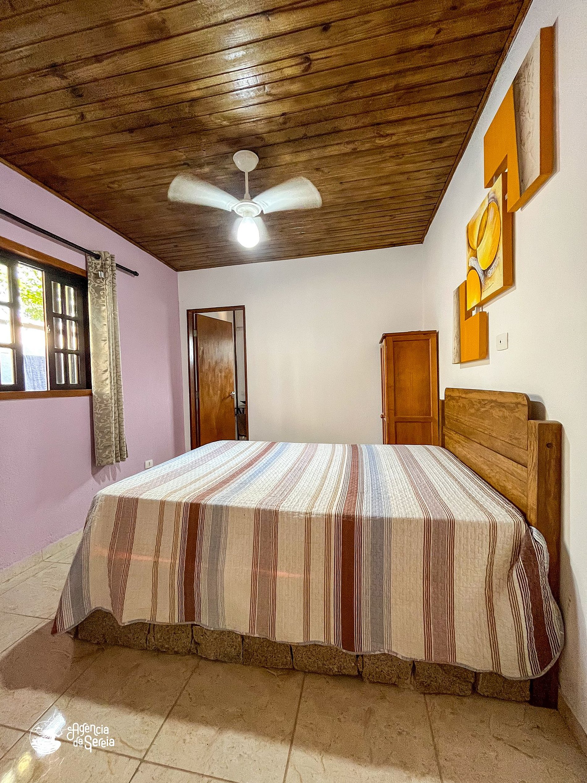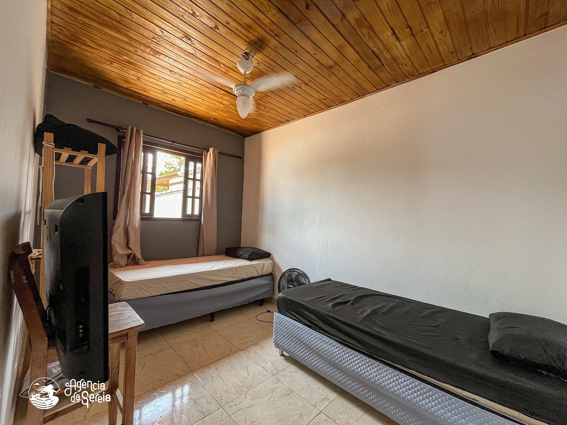Capacidade para acomodar até 7 pessoas em cama, divididas em 3 quartos, sendo 1 suíte com cama de casal (base de pedra) e ventilador de teto e 2 quartos com camas de solteiro (box) e beliche colonial solteiro, além de ventilador de teto. Sala com sofá retrátil, TV e ventilador de teto, ideal para relaxar após um dia de praia. Cozinha completa com todos os utensílios necessários para preparar suas refeições, incluindo filtro, fogão, forno, geladeira, microondas e mesa com balcão em peroba rosa. A área externa conta com uma piscina enorme, para curtir dias de sol preparando um churrasquinho para a galera. A área externa ainda conta com banquinhos de madeira, geladeira e pia para sua comodidade.