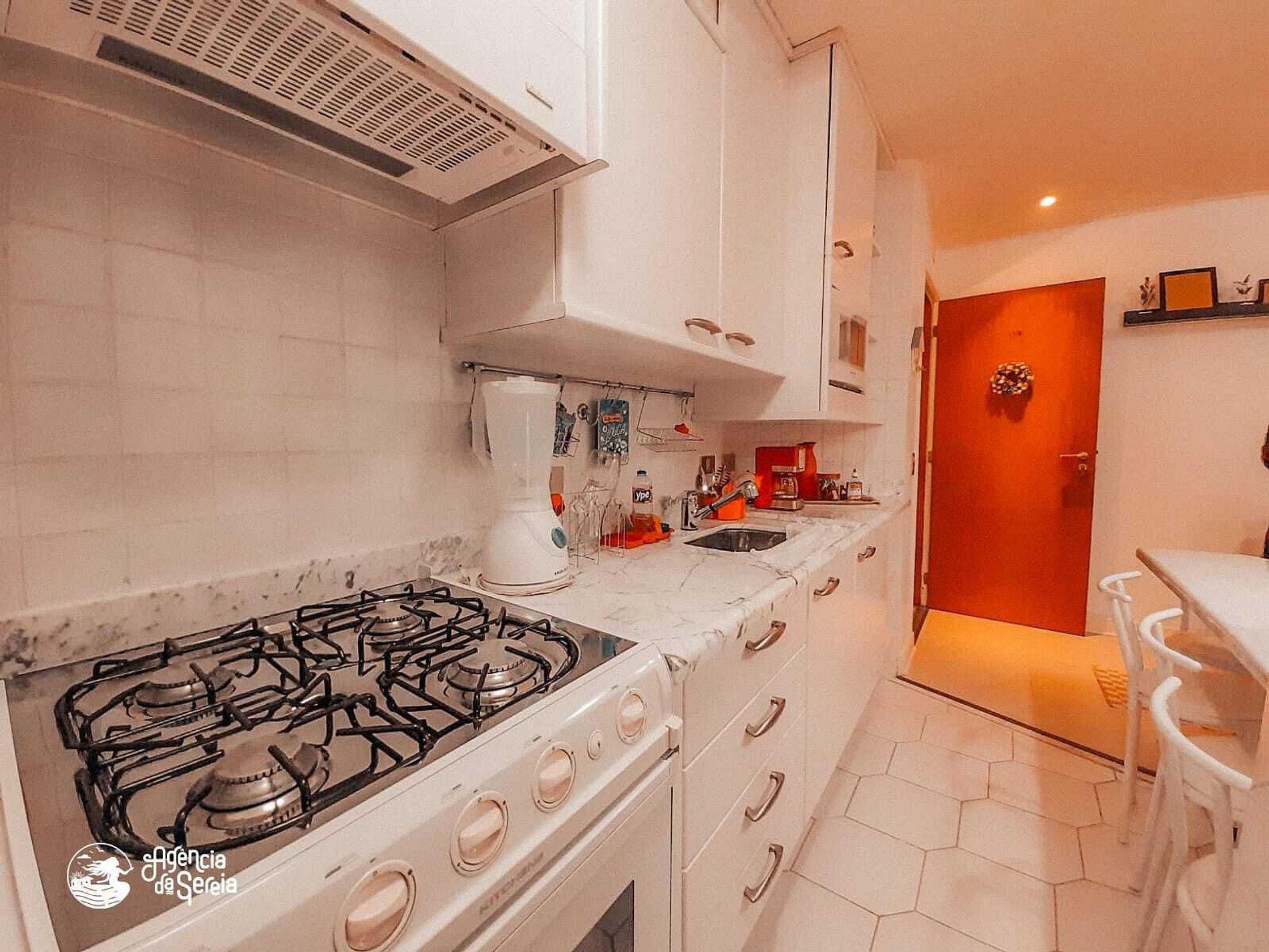 Cozinha completa com fogão, geladeira, micro-ondas, cafeteira, liquidificador e utensílios