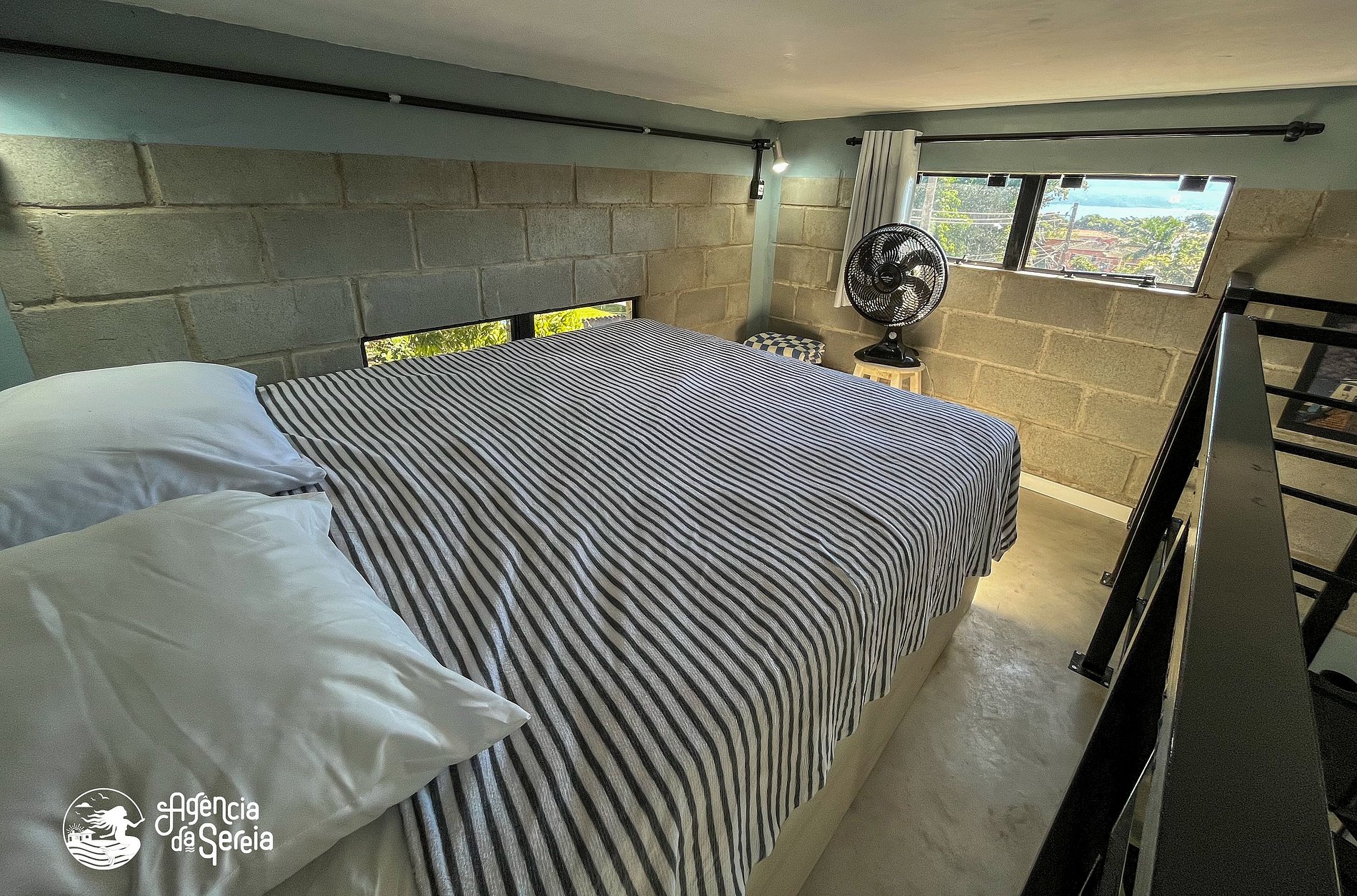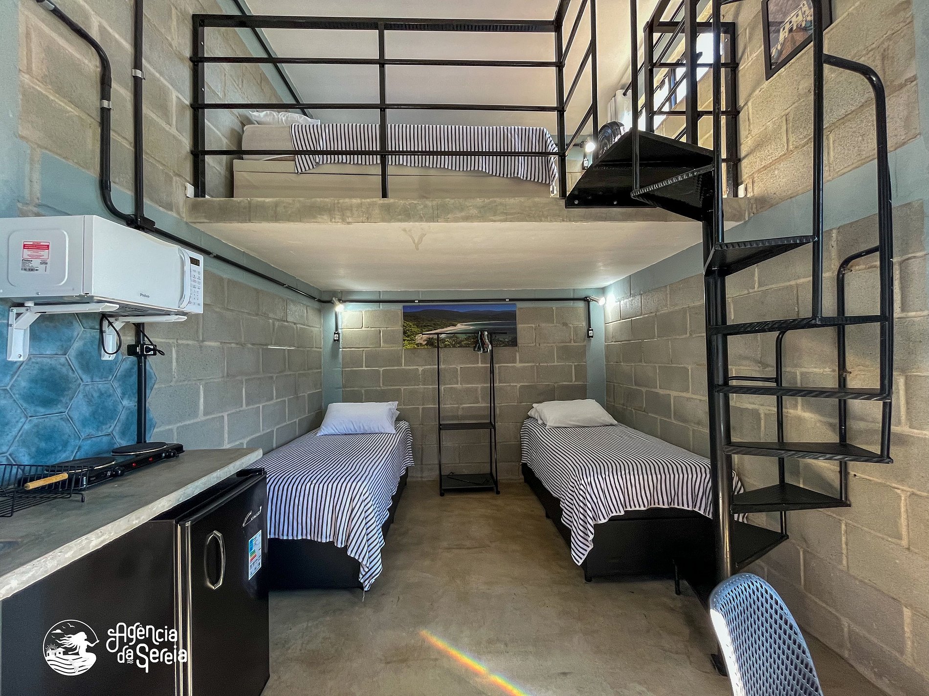 • Quarto com Smart TV, ar condicionado, ventilador de parede, arara com cabides, 2 camas box solteiro (andar debaixo), 1 cama box casal (mezanino), com escada caracol;