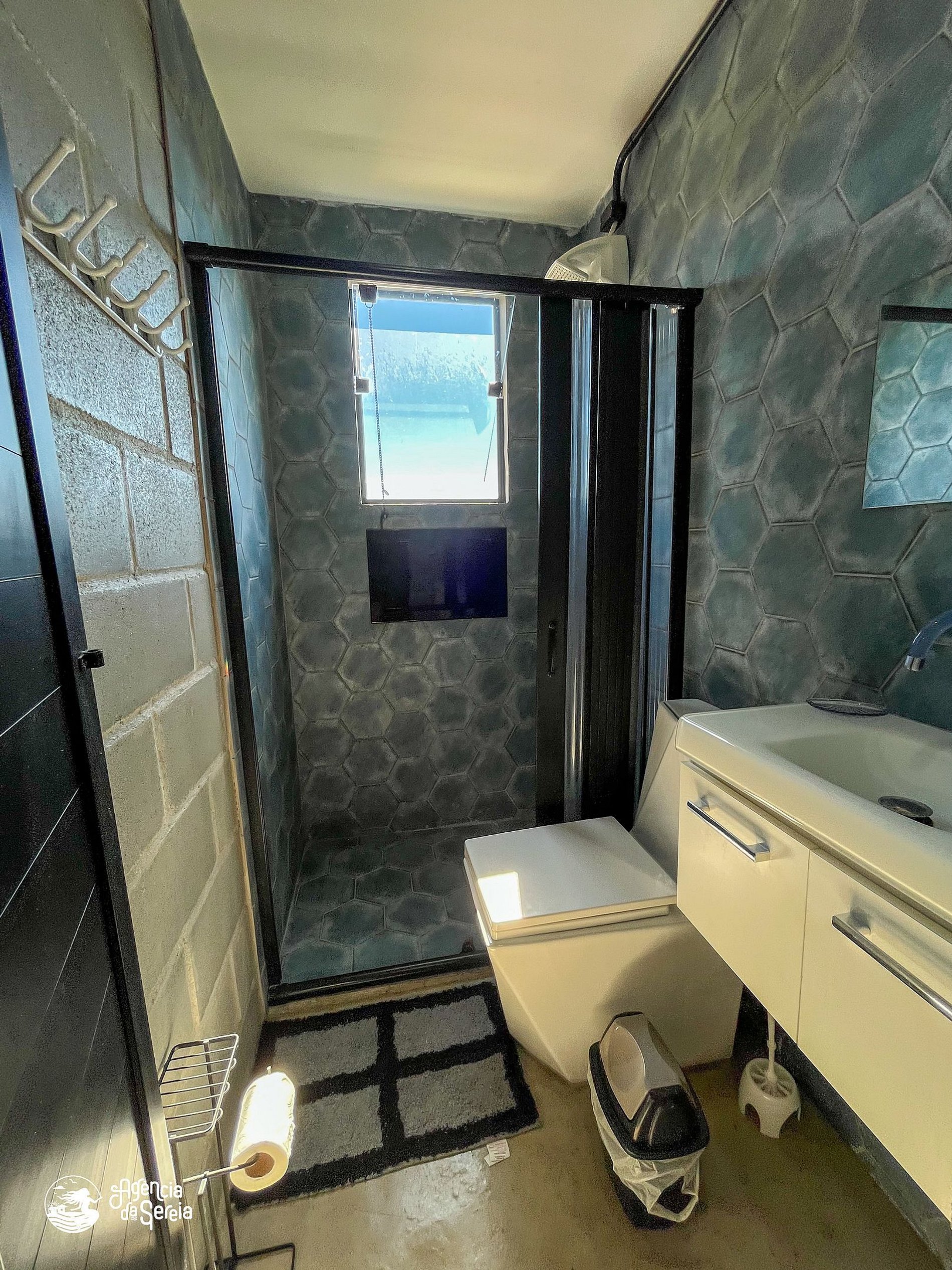 • Banheiro com box sanfonado + janela com vista parcial para o mar;
