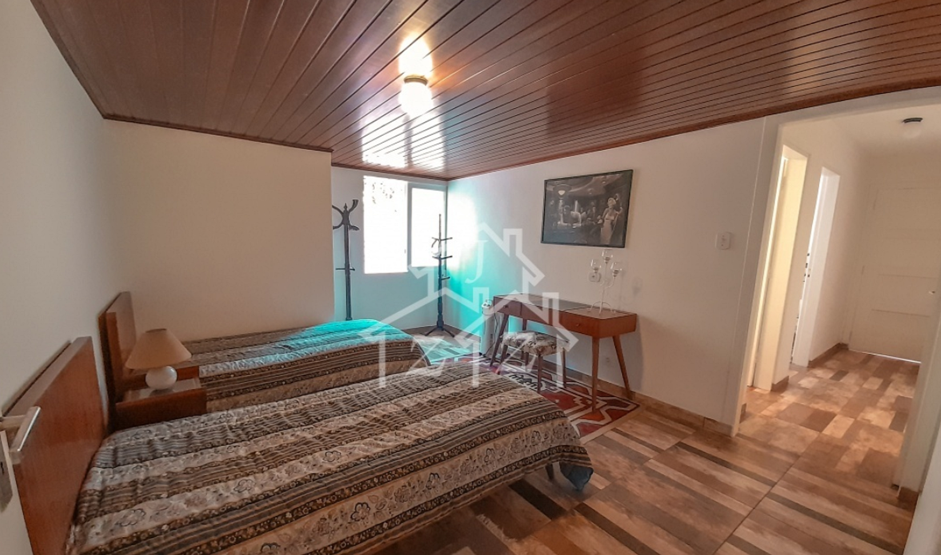 • Andar superior: 3 dormitórios com janelas amplas e uma vista de tirar o fôlego — sendo 1 deles uma suíte. Dois quartos possuem cama de casal, e o outro acomoda até quatro pessoas, com quatro camas de solteiro. Além disso, há mais um banheiro espaçoso e arejado.